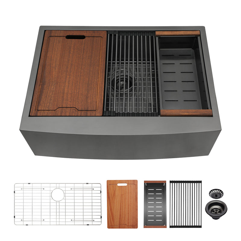 - Farmhouse Apron Single Bowl Stainless Steel Kitchen Sink with an integrated ledge to support sliding accessories. This sink creates a multifunctional workspace to streamline all your kitchen tasks. The workstation kit allows you to work over the sink without losing counter space.Dimension: Overall size: 33'x22'x10', Interior bowl: 31'x16.62', Detph: 9'