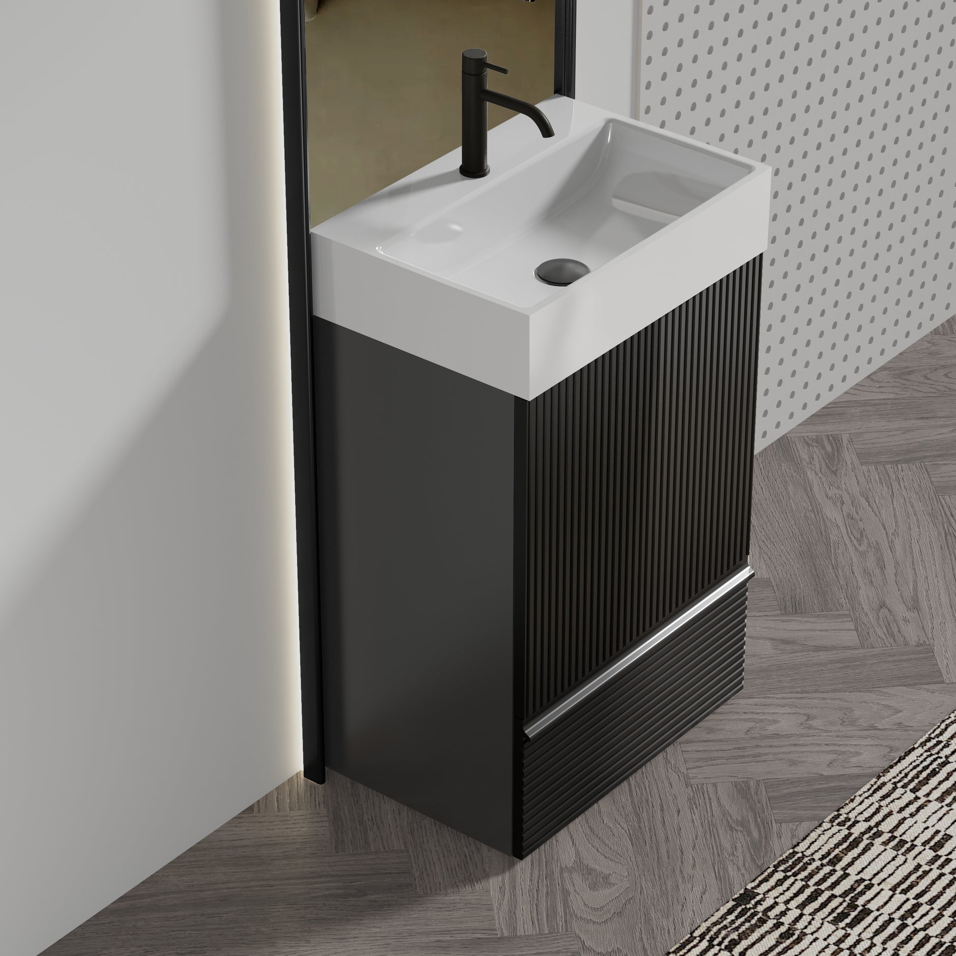 - Matt Black Modern grille-patterned free standing bathroom vanity. A perfect combination of beauty and practicality for any bathroom